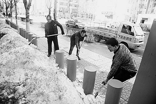工作人員清除自行車網(wǎng)點(diǎn)的積雪