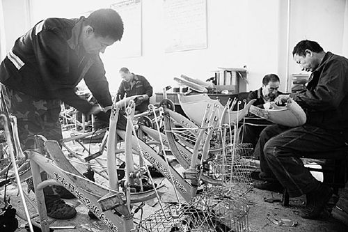 工作人員取掉各網(wǎng)點(diǎn)防護(hù)罩并為控制器安裝電瓶進(jìn)行調(diào)試維修人正在對(duì)自行車進(jìn)行檢修