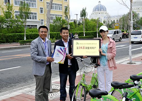 黑河市公共自行車服務(wù)中心領(lǐng)導(dǎo)為公共自行車第10萬(wàn)次使用用戶頒發(fā)榮譽(yù)證書、贈(zèng)送禮品