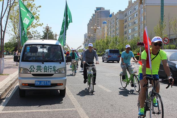 參加活動的民建會員騎著插有“兩國一城,一卡通行”、“綠色出行,低碳環(huán)?!睒?biāo)語的公共自行車,從市區(qū)世紀(jì)廣場出發(fā),沿王肅街、郵政路、興安街、西興路、文化街、公園路、中央街、環(huán)城路一路騎行,宣傳綠色環(huán)保理念。