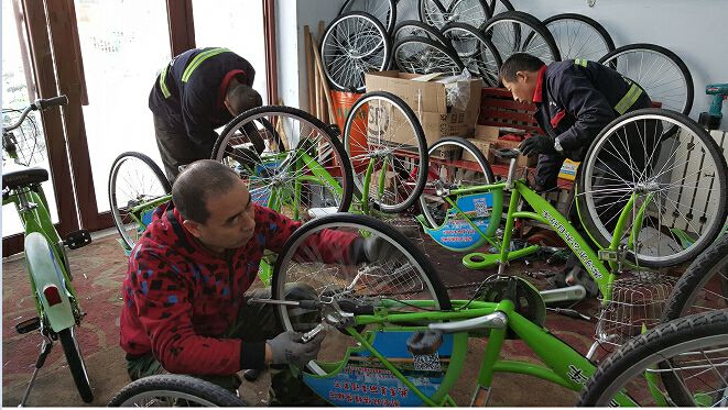 維修師傅正在檢修每一輛“小綠”,保證2016年開始運(yùn)營并投放每一輛自行車都能嶄新如初,讓每位騎公共自行車的市民滿意,并且保證市民安全。