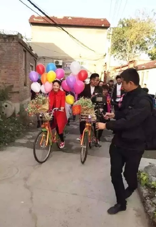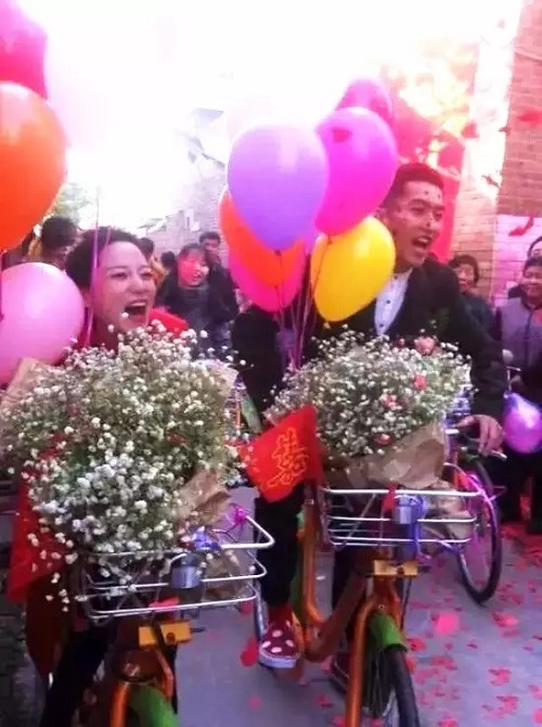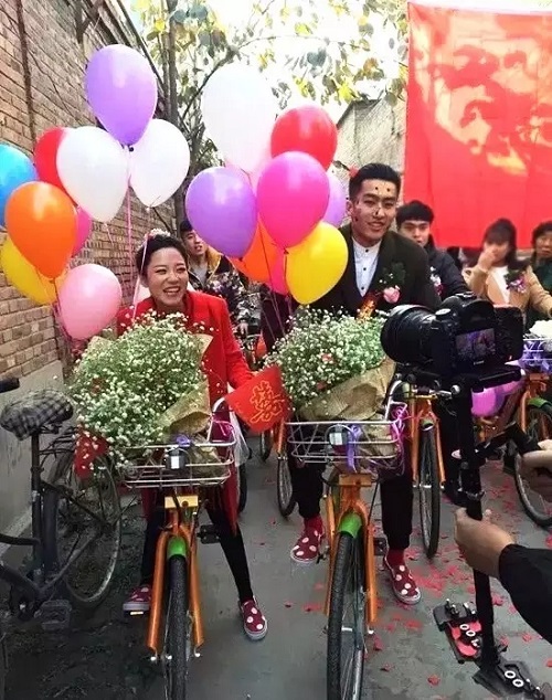 鮮花飄香,氣球傳情。當(dāng)天中午,一對(duì)新人滿面笑容,腳穿同種款式的紅色板鞋,騎著五彩繽紛的城市公共自行車(chē)穿行于大街小巷,親朋好友同樣騎車(chē)陪伴左右,一路歡聲笑語(yǔ),幸福滿滿。