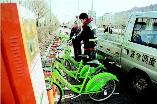 圖為4月7日工作人員將公共自行車停放至存取網(wǎng)點(diǎn)。