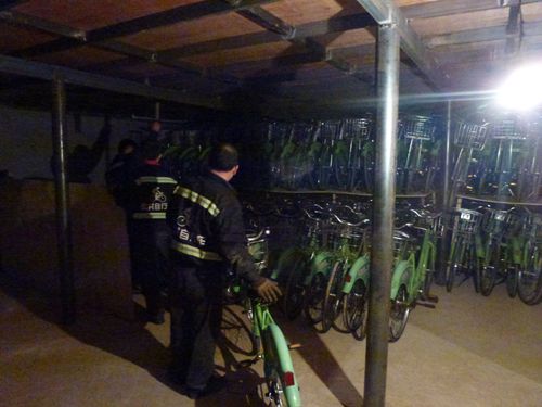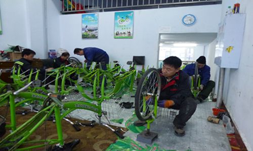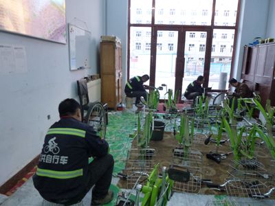 黑河公共自行車(chē)冬季停止運(yùn)營(yíng)后,留下10名有維修自行車(chē)技術(shù)的員工,將2230輛自行車(chē)逐一進(jìn)行檢修保養(yǎng),入庫(kù)存放,到明年春季根據(jù)天氣情況適時(shí)投入使用。下圖為維修人員正在認(rèn)真地工作